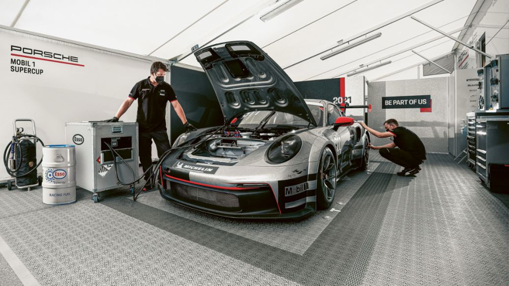 The Porsche Mobil 1 Supercup introduced renewable fuels at the start of the 2021 season. The international one-make cup will initially use advanced second-generation biofuels. This will already considerably reduce CO₂ emissions. The plan is then for fully synthetic fuels – otherwise known as eFuels – to be used in the 2022 season. In this flagship project, Porsche and its project partner ExxonMobil will test the suitability for use of renewable liquid fuels under tough motorsport conditions. The new Porsche 911 GT3 Cup with its high-revving six-cylinder boxer engine serves as the ideal test lab for the Esso Renewable Racing Fuels – its approximately 375 kW (510 PS) 4.0-litre engine has already been tested for use with renewable fuels. The aim is to gather important experience for their potential further development with a view to using them in production vehicles in the future. The Porsche Mobil 1 Supercup will be held during European races of the FIA Formula 1 World Championship.