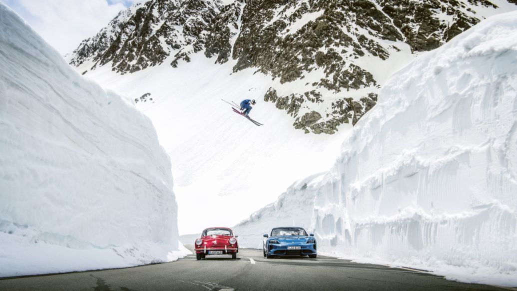 The Porsche Jump is the iconic restaging of a black and white photo taken in the 1960s and features two-time Olympic champion Svindal jumping over a Porsche Taycan parked between walls of snow of many metres in height.