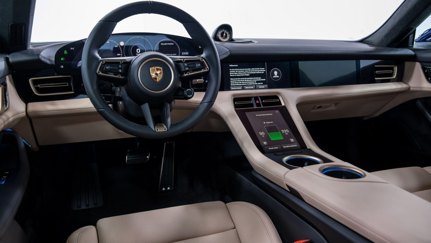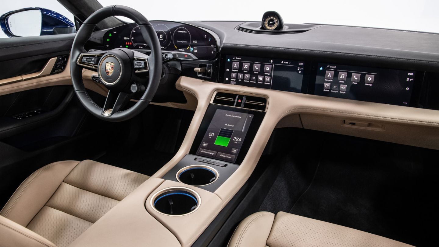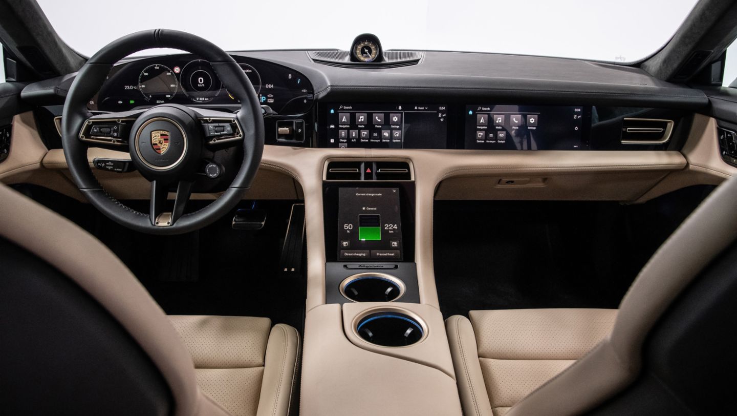 The cockpit signals the start of a new era of interior design at Porsche with its clear structure and a completely new architecture. The free-standing, curved instrument cluster forms the highest point on the dashboard. This places a clear focus on the driver axis. A central, 10.9-inch infotainment display and an optional passenger display are combined to form an integrated glass band in a black-panel look. All user interfaces have been designed from scratch for the Taycan. The number of classic hardware controls such as switches and buttons has been greatly reduced. Instead, control is intelligent and intuitive – using touch operation or the voice control function, which responds to the command “Hey Porsche”.