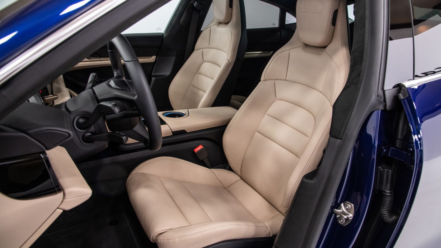 With the Taycan, Porsche offers an entirely leather-free interior option for the first time. Interiors made from innovative recycled materials underscore the sustainable concept of the electric sports car. “Foot garages” – recesses in the battery in the rear foot well – ensure seating comfort for rear seat passengers while allowing the typically low roof height found on sports cars. Two luggage compartments are available: the front compartment has a capacity of 2.8 cubic feet and the rear 12.9 cubic feet.
