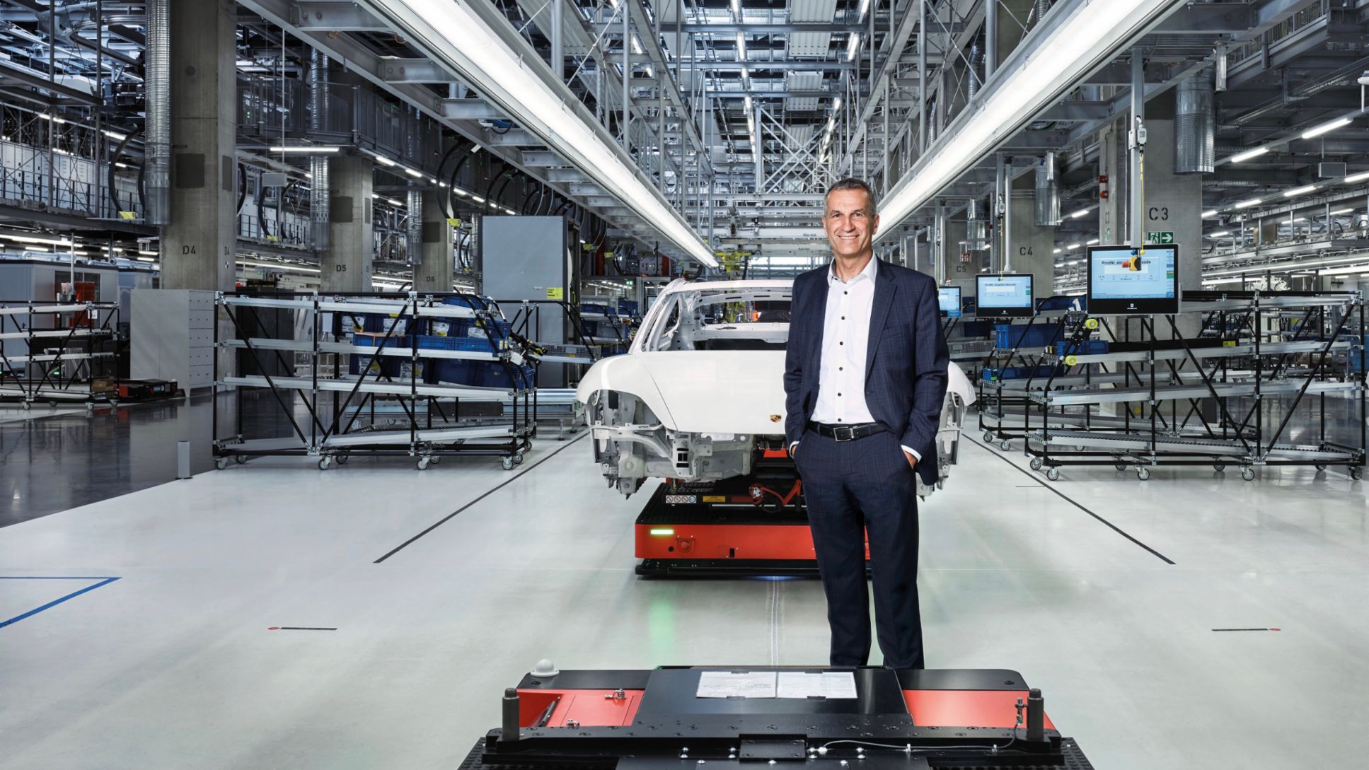 Ja, wir konnten die Taycan-Fertigung von Beginn an komplett neu konzipieren. Das hat den Vorteil, dass wir in Zuffenhausen nun hochinnovative Produktionsstandards etablieren. Den Taycan montieren wir auf einer sogenannten Flexi-Line mit fahrerlosen Transportsystemen, die sich selbstständig von Station zu Station bewegen. Das gibt uns nicht nur neue Freiheiten im Produktionsbetrieb, sondern auch bei der Architektur des neuen Werks. Die Flexi-Line bietet riesige Vorteile in puncto Investitionen und Flexibilität. Durch den Verzicht auf fest im Fundament integrierte Fließbänder sparen wir rund 30 Prozent Investitionskosten. Und ohne das starre Fließband können wir die Fertigung jederzeit modifizieren, Neues integrieren oder einen Bypass fahren, um besondere Kundenwünsche umzusetzen.
