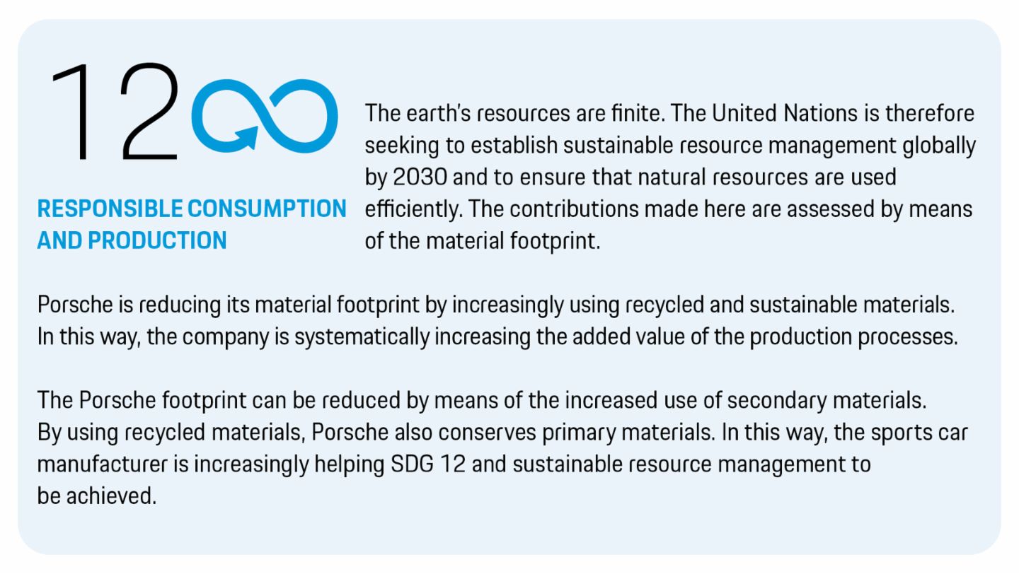 Porsche wishes to reduce the negative environmental impacts of its material use. The company is focusing on using secondary or renewable raw materials in its vehicles. Materials are additionally to be extracted and sourced in environmentally responsible ways. Porsche has therefore defined the proportion of sustainable materials at the fleet level (for example plastic recyclates and secondary source metals) as a performance indicator for new vehicle projects as of 2025. A higher proportion of sustainable materials also reduces CO₂ emissions in the supply chain, thereby contributing to decarbonisation.